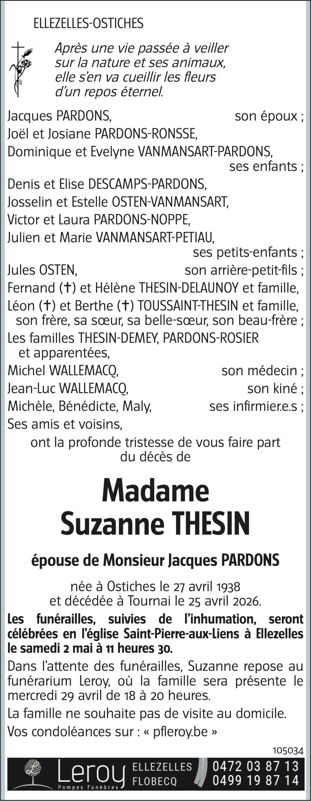 Les funérailles , suivies de l’inhumation au cimetière d’Ellezelles seront célébrées en l’église Saint -Pierre-aux-Liens à Ellezelles le samedi 2 mai 2026 à 11h30.